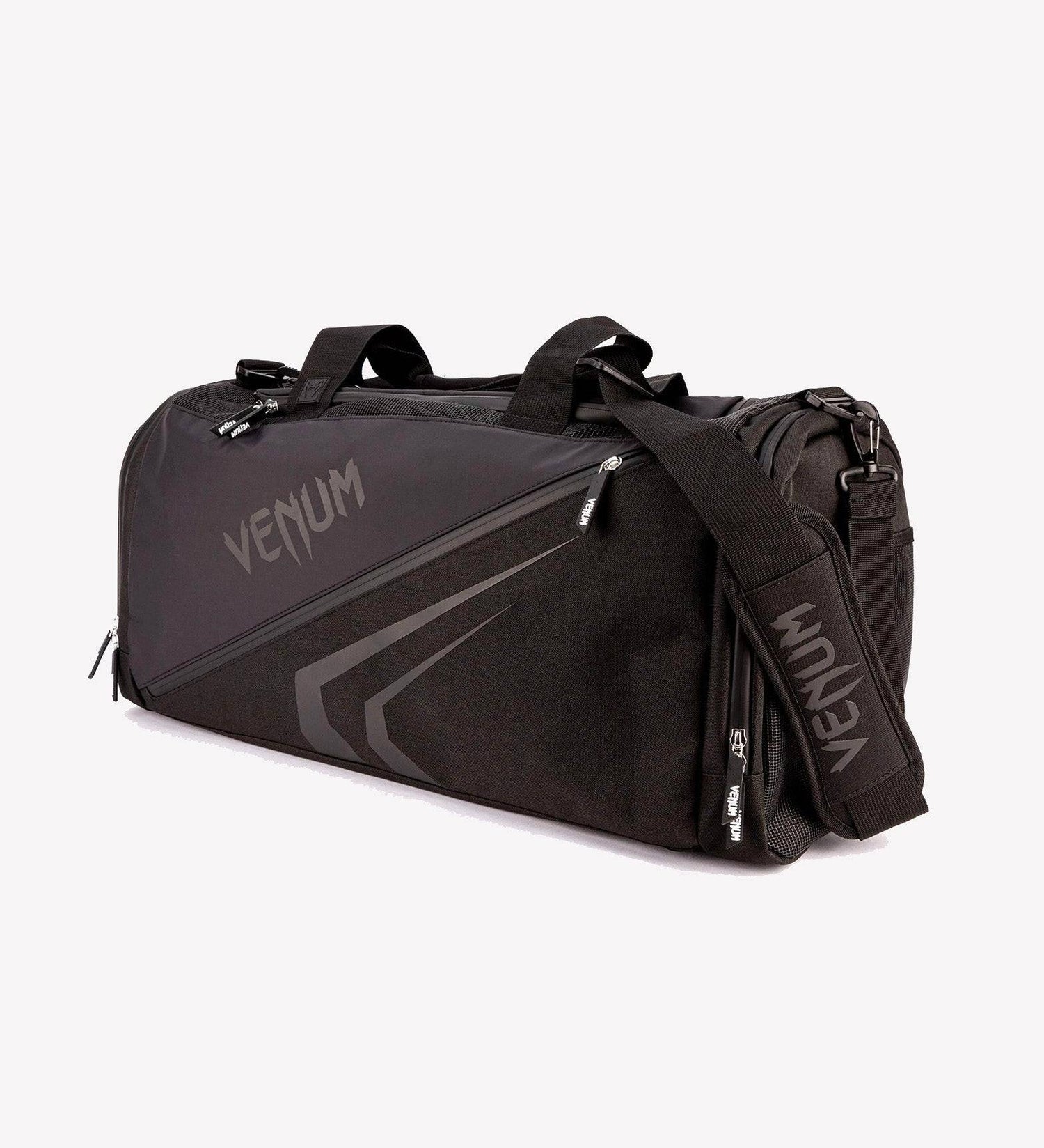 Schwarze Sporttasche von Venum mit schwarzem Aufdruck. Diese Sporttasche verfügt über mehrere Fächer, darunter ein Fach mit Belüftungspaneelen. Die Tasche verfügt über einen verstellbaren Schultergurt und kann auch als Rucksack getragen werden. Das Gesamtvolumen dieser Sporttasche beträgt 63 Liter.