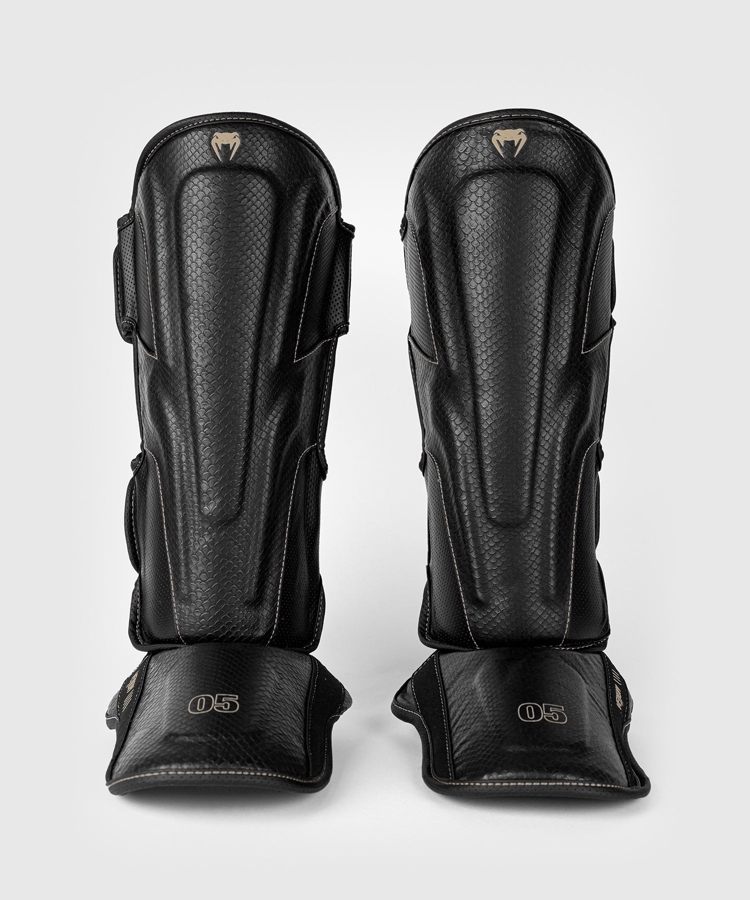 Die beigen Nähte folgen den anatomischen Linien der Schützer und setzen einen dezenten Kontrast. Das einzigartige Schuppen-Texturmuster unterstreicht den aggressiven Look, für den Venum weltweit bekannt ist . eine optische Ansage, bei jedem Kick alles zu geben.