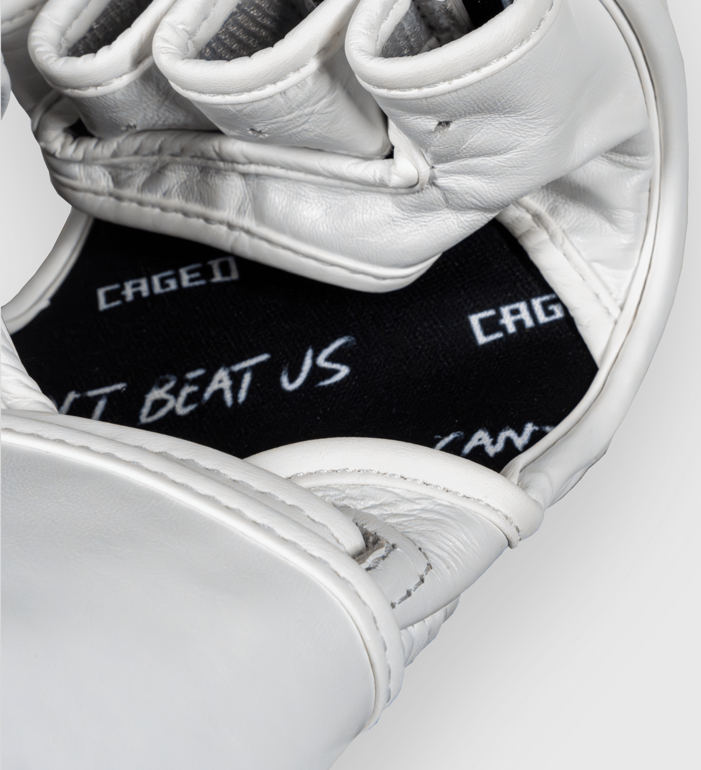 Die Innenseite ist mit einem hochwertigen Stoff ausgekleidet, der sich weich anfühlt und optimalen Komfort während langer Trainingseinheiten bietet. Diese bequeme Innenseite ist ebenfalls mit dem Caged-Logo und dem Slogan 'Can't beat us' bedruckt.